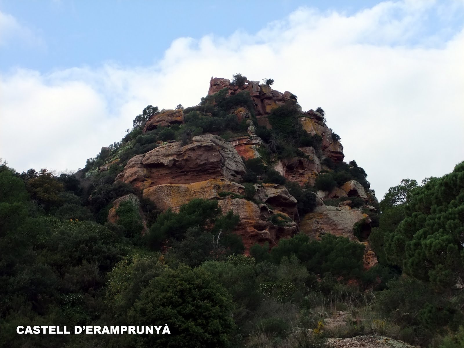 costat d’una de les estacions del Via Crucis. Un panell informatiu ens avisa: “Castell d’Eramprunyà i Església de Sant Miquel. Recinte tancat per obres de restauració”. Molt aviat, el sender ens regala una sorpresa: la Roca Foradada; es tracta d’una mena d’arc de pedra, veritable finestra que s’aboca sobre la vall, emmarcant una bonica panoràmica. Ara transitem pel Garraf Roig, format per gresos silicis; per això, les pedres de l’ermita, el terra del corriol, les roques i el mateix castell d’Eramprunyà presenten una coloració vermellosa, mentre el contrapunt està pintat del verd de
